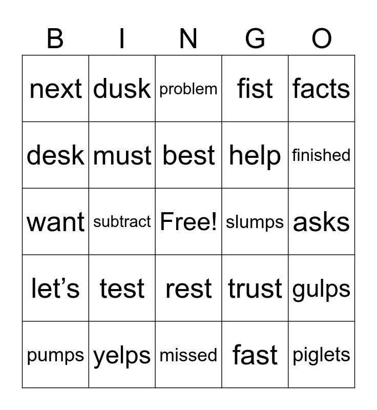 This bingo card has a free space and 24 words: test, yelps, best, pumps, facts, next, desk, dusk, slumps, rest, help, want, trust, gulps, must, fast, asks, problem, finished, subtract, piglets, let’s, fist and missed.