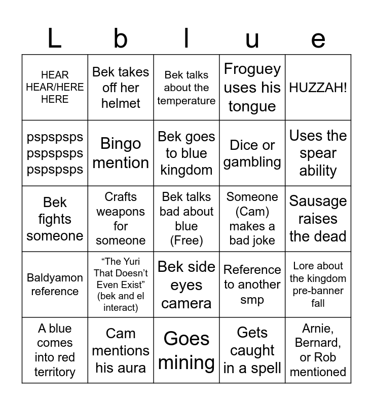 This bingo card has a free space and 24 words: “The Yuri That Doesn’t Even Exist” (bek and el interact), Cam mentions his aura, Bek goes to blue kingdom, A blue comes into red territory, HUZZAH!, HEAR HEAR/HERE HERE, pspspsps pspspsps pspspsps, Bek takes off her helmet, Someone (Cam) makes a bad joke, Bek side eyes camera, Dice or gambling, Bek fights someone, Reference to another smp, Lore about the kingdom pre-banner fall, Bingo mention, Gets caught in a spell, Sausage raises the dead, Bek talks about the temperature, Uses the spear ability, Crafts weapons for someone, Arnie, Bernard, or Rob mentioned, Baldyamon reference, Froguey uses his tongue and Goes mining.