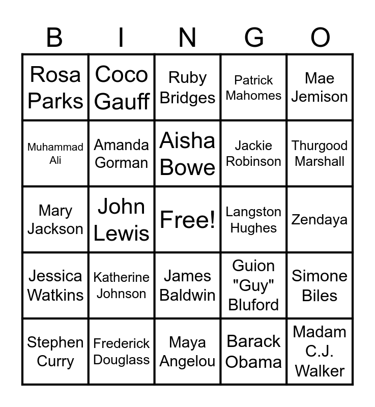 This bingo card has a free space and 30 words: Frederick Douglass, Harriet Tubman, John Lewis, Martin Luther King Jr., Rosa Parks, Ruby Bridges, Amanda Gorman, James Baldwin, Langston Hughes, Maya Angelou, Zendaya, Madam C.J. Walker, Barack Obama, Jane Bolin, Thurgood Marshall, Charles Bolden, Guion "Guy" Bluford, Jessica Watkins, Katherine Johnson, Mae Jemison, Mary Jackson, Victor Glover, Coco Gauff, Jackie Robinson, Muhammad Ali, Patrick Mahomes, Simone Biles, Stephen Curry, Aisha Bowe and George Washington Carver.