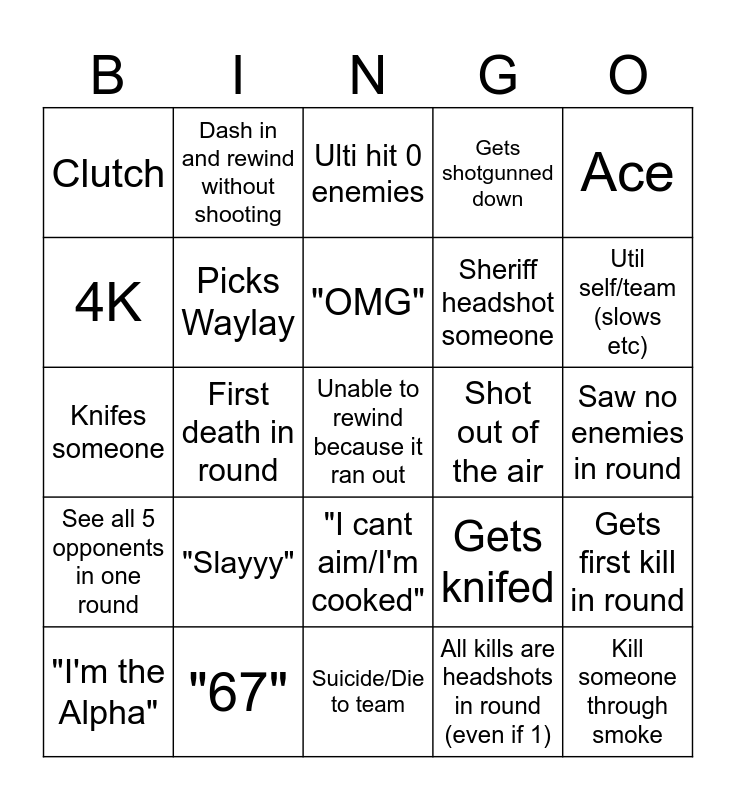 This bingo card has a free space and 24 words: "Slayyy", "67", "OMG", "I'm the Alpha", Ace, Clutch, 4K, Dash in and rewind without shooting, Shot out of the air, "I cant aim/I'm cooked", Sheriff headshot someone, Knifes someone, Gets knifed, Gets first kill in round, Picks Waylay, All kills are headshots in round (even if 1), Saw no enemies in round, Ulti hit 0 enemies, Util self/team (slows etc), First death in round, Kill someone through smoke, See all 5 opponents in one round, Gets shotgunned down and Suicide/Die to team.