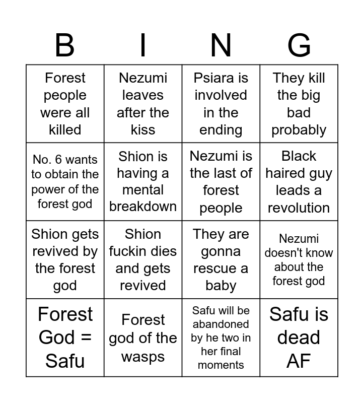 This bingo card has 16 words: Forest god of the wasps, Nezumi doesn't know about the forest god, Psiara is involved in the ending, Forest people were all killed, Shion gets revived by the forest god, Nezumi leaves after the kiss, They are gonna rescue a baby, Safu will be abandoned by he two in her final moments, No. 6 wants to obtain the power of the forest god, Shion is having a mental breakdown, Forest God = Safu, They kill the big bad probably, Shion fuckin dies and gets revived, Black haired guy leads a revolution, Nezumi is the last of forest people and Safu is dead AF.