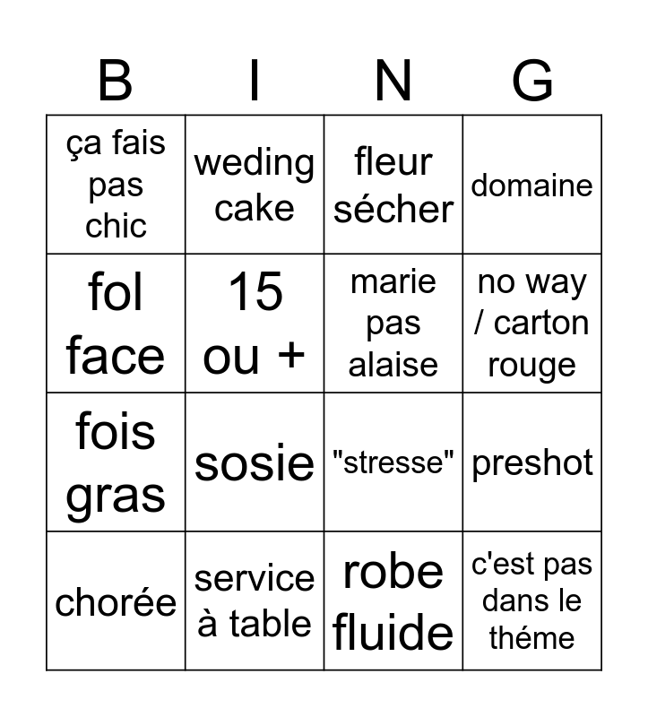 This bingo card has 16 words: service à table, preshot, fleur sécher, ça fais pas chic, fois gras, weding cake, "stresse", robe fluide, fol face, 15 ou +, chorée, domaine, sosie, no way / carton rouge, marie pas alaise and c'est pas dans le théme.