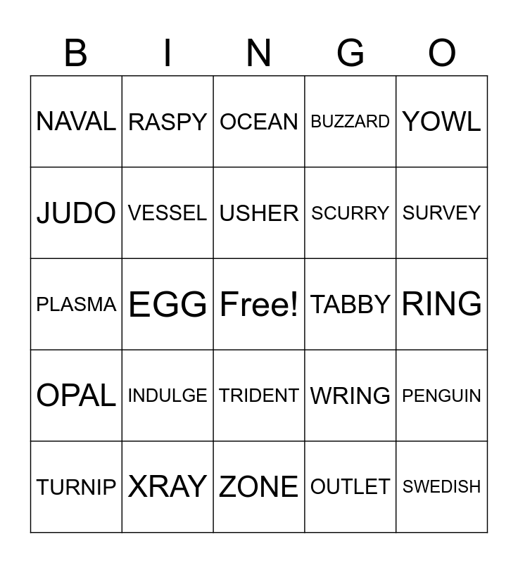 This bingo card has a free space and 24 words: INDULGE, XRAY, USHER, TURNIP, YOWL, NAVAL, JUDO, RASPY, TABBY, TRIDENT, SCURRY, PLASMA, WRING, PENGUIN, VESSEL, OUTLET, RING, OCEAN, SURVEY, EGG, SWEDISH, OPAL, BUZZARD and ZONE.