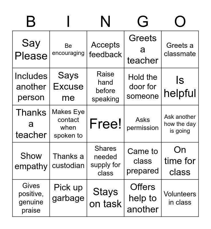This bingo card has a free space and 24 words: Thanks a custodian, Pick up garbage, Raise hand before speaking, Gives positive, genuine praise, Greets a classmate, Say Please, Includes another person, Be encouraging, Asks permission, Shares needed supply for class, Hold the door for someone, Thanks a teacher, Came to class prepared, On time for class, Says Excuse me, Offers help to another, Ask another how the day is going, Accepts feedback, Is helpful, Makes Eye contact when spoken to, Volunteers in class, Show empathy, Greets a teacher and Stays on task.