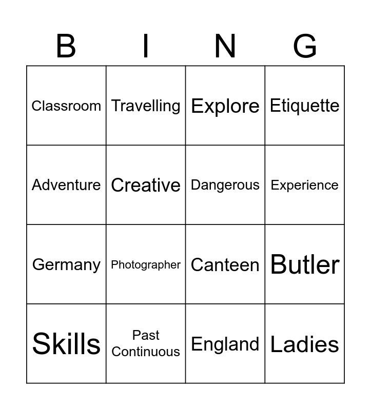 This bingo card has 16 words: Past Continuous, Butler, Explore, Classroom, Germany, Travelling, Canteen, England, Adventure, Creative, Skills, Etiquette, Photographer, Experience, Dangerous and Ladies.