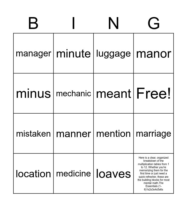 This bingo card has 17 words: loaves, location, luggage, manager, manner, manor, marriage, meant, Free!, mechanic, medicine, mention, minus, minute, mistaken, misunderstand and Here is a clear, organized breakdown of the multiplication tables from 1 to 12. Whether you're memorizing them for the first time or just need a quick refresher, these are the building blocks for most mental math.The Essentials (1-6)1s2s3s4s5s6s.