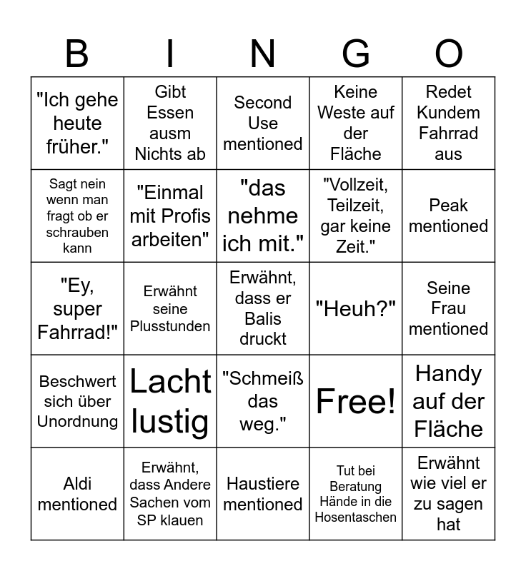 This bingo card has 25 words: Lacht lustig, Haustiere mentioned, "das nehme ich mit.", Aldi mentioned, Redet Kundem Fahrrad aus, "Ich gehe heute früher.", Sagt nein wenn man fragt ob er schrauben kann, Gibt Essen ausm Nichts ab, "Heuh?", "Schmeiß das weg.", "Vollzeit, Teilzeit, gar keine Zeit.", "Ey, super Fahrrad!", Free!, Handy auf der Fläche, "Einmal mit Profis arbeiten", Erwähnt wie viel er zu sagen hat, Seine Frau mentioned, Second Use mentioned, Peak mentioned, Erwähnt seine Plusstunden, Erwähnt, dass er Balis druckt, Erwähnt, dass Andere Sachen vom SP klauen, Beschwert sich über Unordnung, Keine Weste auf der Fläche and Tut bei Beratung Hände in die Hosentaschen.