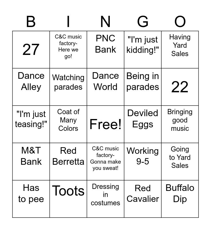 This bingo card has a free space and 24 words: Red Berretta, Toots, Dance World, Has to pee, Having Yard Sales, 27, Dance Alley, C&C music factory-Here we go!, Deviled Eggs, C&C music factory-Gonna make you sweat!, Being in parades, "I'm just teasing!", Working 9-5, Going to Yard Sales, Watching parades, Red Cavalier, Bringing good music, PNC Bank, 22, Coat of Many Colors, Buffalo Dip, M&T Bank, "I'm just kidding!" and Dressing in costumes.