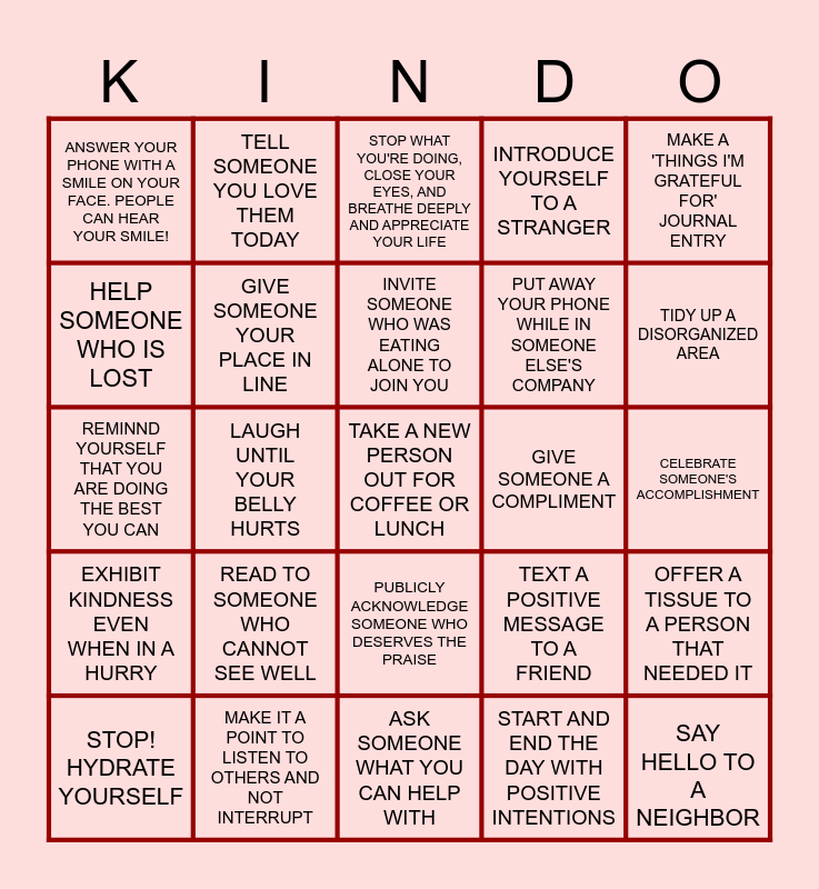 This bingo card has a free space and 49 words: WISH SOMEONE AN AMAZING DAY!, SAY HELLO TO A NEIGHBOR, BE PATIENT WITH SOMEONE, ASK SOMEONE WHAT YOU CAN HELP WITH, READ TO SOMEONE WHO CANNOT SEE WELL, LEAVE A NOTE OF KINDNESS IN SOMEONES MAILBOX, TELL SOMEONE YOU LOVE THEM TODAY, VISIT A SICK FRIEND, HELP SOMEONE WHO IS LOST, VOLUNTEER TO DO SOMETHING IN OUR COMMUNITY, GIVE SOMEONE YOUR PLACE IN LINE, INTRODUCE YOURSELF TO A STRANGER, OFFER A TISSUE TO A PERSON THAT NEEDED IT, TEXT A POSITIVE MESSAGE TO A FRIEND, GET AT LEAST 30 MINUTES OF EXERCISE TODAY, HOLD A DOOR OPEN, INVITE SOMEONE WHO WAS EATING ALONE TO JOIN YOU, GIVE SOMEONE A COMPLIMENT, MAKE SOMEONE LAUGH TODAY, MAKE A 'THINGS I'M GRATEFUL FOR' JOURNAL ENTRY, LAUGH UNTIL YOUR BELLY HURTS, START AND END THE DAY WITH POSITIVE INTENTIONS, ANSWER YOUR PHONE WITH A SMILE ON YOUR FACE. PEOPLE CAN HEAR YOUR SMILE!, PUT AWAY YOUR PHONE WHILE IN SOMEONE ELSE'S COMPANY, TELL SOMEONE THEY ARE DOING A GREAT JOB, TIDY UP A DISORGANIZED AREA, STOP! HYDRATE YOURSELF, DON'T COMPLAIN FOR 24 HOURS, PUBLICLY ACKNOWLEDGE SOMEONE WHO DESERVES THE PRAISE, EXHIBIT KINDNESS EVEN WHEN IN A HURRY, HELP SOMEONE THAT COULD USE AN EXTRA HAND, GET SOME EXERCISE DOING SOMETHING YOU ENJOY!, RECOMMEND AN UPLIFTING MOVIE OR BOOK TO SOMEONE, SMILE AND GREET SOMEONE YOU MEET IN THE HALLWAY, MAKE IT A POINT TO LISTEN TO OTHERS AND NOT INTERRUPT, LEAVE COINS AT A VENDING MACHINE SO SOMEONE CAN ENJOY A TREAT, CALL SOMEONE YOU'VE BEEN MEANING TO REACH OUT TO, TAKE 5 MINUTES TO THINK ABOUT SOMETHING POSITIVE THAT HAPPENED TODAY, CELEBRATE SOMEONE'S ACCOMPLISHMENT, LEAVE A GLOWING REVIEW OF A LOCAL BUSINESS ONLINE, REFLECT ON THREE THINGS YOU ACOMPLISHED THIS WEEK, WRITE A LIST OF THINGS YOU APPRECIATE ABOUT YOUR BOSS, YOUR SPOUSE, OR A FRIEND AND GIVE IT TO THEM, GO FOR A LONG WALK, WAKE UP EARLY TO EXERCISE, REMINND YOURSELF THAT YOU ARE DOING THE BEST YOU CAN, STOP WHAT YOU'RE DOING, CLOSE YOUR EYES, AND BREATHE DEEPLY AND APPRECIATE YOUR LIFE, DRAW A HEART IN THE MIRROR AFTER YOUR SHOWER, ASK SOMEONE HOW THEY ARE DOING, AND REALLY LISTEN TO THEIR ANSWER and FOLLOW A TEN MINUTE STRETCHING ROUTINE.