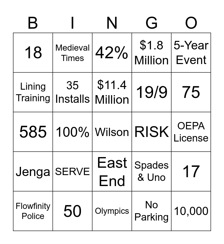 This bingo card has a free space and 24 words: SERVE, 50, $11.4 Million, Flowfinity Police, 5-Year Event, 18, Lining Training, Medieval Times, RISK, East End, 19/9, 585, Spades & Uno, 17, 35 Installs, No Parking, OEPA License, 42%, 75, 100%, 10,000, Jenga, $1.8 Million and Olympics.