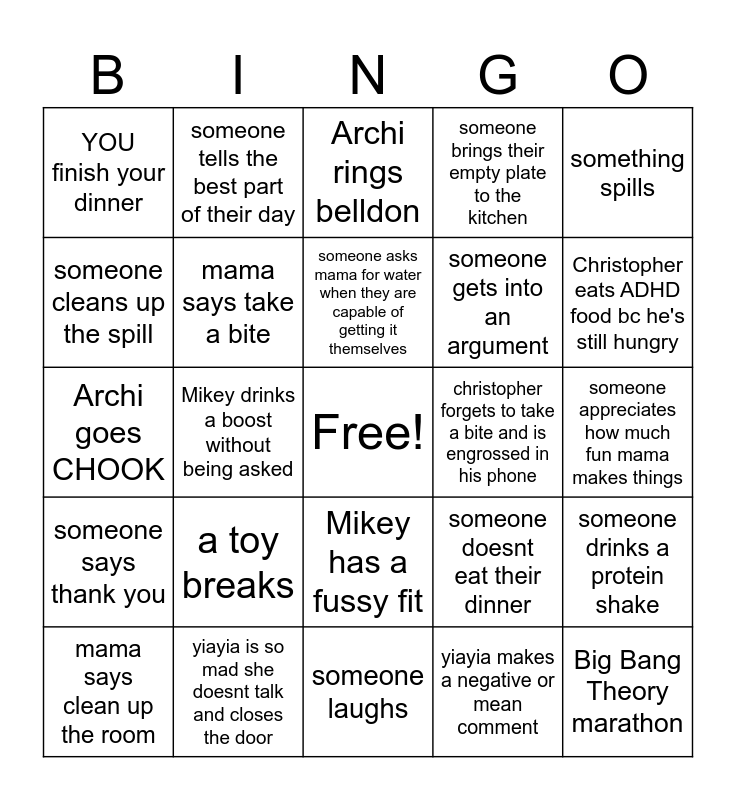 This bingo card has a free space and 24 words: a toy breaks, yiayia is so mad she doesnt talk and closes the door, someone asks mama for water when they are capable of getting it themselves, mama says clean up the room, something spills, YOU finish your dinner, someone cleans up the spill, someone tells the best part of their day, christopher forgets to take a bite and is engrossed in his phone, Mikey has a fussy fit, someone gets into an argument, Archi goes CHOOK, someone doesnt eat their dinner, someone drinks a protein shake, mama says take a bite, yiayia makes a negative or mean comment, someone appreciates how much fun mama makes things, Archi rings belldon, Christopher eats ADHD food bc he's still hungry, Mikey drinks a boost without being asked, Big Bang Theory marathon, someone says thank you, someone brings their empty plate to the kitchen and someone laughs.