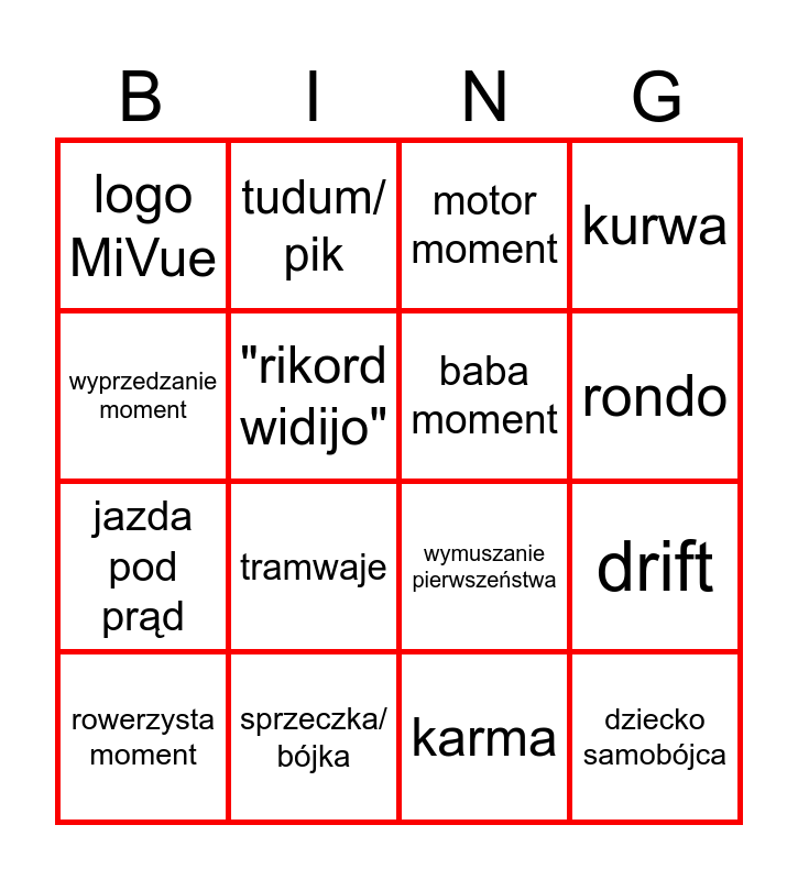 This bingo card has 25 words: DEBIL, disco polo, rondo, Toruńska, wyprzedzanie moment, logo MiVue, "rikord widijo", tudum/ pik, sprzeczka/ bójka, kurwa, jazda pod prąd, wymuszanie pierwszeństwa, pasy, rozmowa, baba moment, zwierzyna moment, karma, motor moment, tramwaje, drift, rowerzysta moment, menel+, dziecko samobójca, kurwa and bedoes moment.
