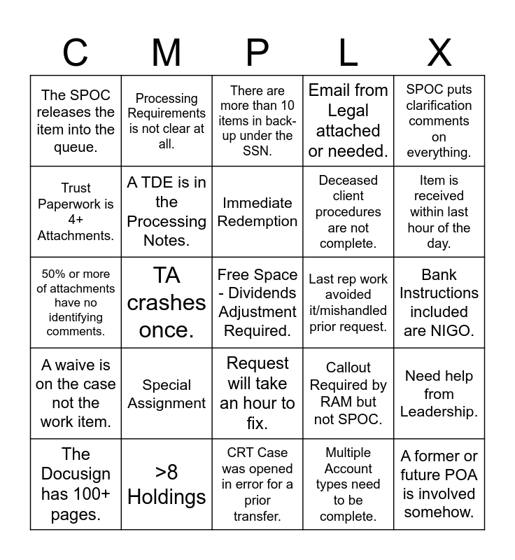 This bingo card has a free space and 24 words: Special Assignment, >8 Holdings, Immediate Redemption, The Docusign has 100+ pages., SPOC puts clarification comments on everything., The SPOC releases the item into the queue., Trust Paperwork is 4+ Attachments., Processing Requirements is not clear at all., Last rep work avoided it/mishandled prior request., Request will take an hour to fix., Deceased client procedures are not complete., 50% or more of attachments have no identifying comments., Callout Required by RAM but not SPOC., Need help from Leadership., A TDE is in the Processing Notes., Multiple Account types need to be complete., Bank Instructions included are NIGO., There are more than 10 items in back-up under the SSN., Item is received within last hour of the day., TA crashes once., A former or future POA is involved somehow., A waive is on the case not the work item., Email from Legal attached or needed. and CRT Case was opened in error for a prior transfer..