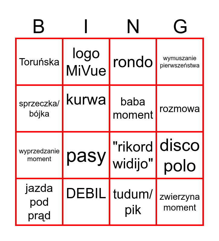This bingo card has 16 words: DEBIL, disco polo, rondo, Toruńska, wyprzedzanie moment, logo MiVue, "rikord widijo", tudum/ pik, sprzeczka/ bójka, kurwa, jazda pod prąd, wymuszanie pierwszeństwa, pasy, rozmowa, baba moment and zwierzyna moment.