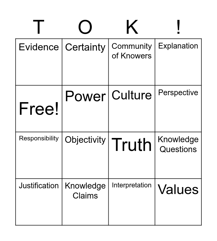 This bingo card has 16 words: Knowledge Claims, Knowledge Questions, Community of Knowers, Evidence, Responsibility, Certainty, Truth, Interpretation, Free!, Power, Justification, Explanation, Objectivity, Perspective, Culture and Values.