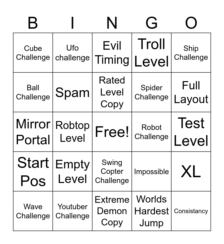 This bingo card has a free space and 24 words: Empty Level, Youtuber Challenge, Rated Level Copy, Wave Challenge, Ship Challenge, Cube Challenge, Ball Challenge, Ufo challenge, Robot Challenge, Swing Copter Challenge, Spider Challenge, Mirror Portal, Impossible, XL, Spam, Worlds Hardest Jump, Test Level, Evil Timing, Full Layout, Robtop Level, Consistancy, Start Pos, Troll Level and Extreme Demon Copy.