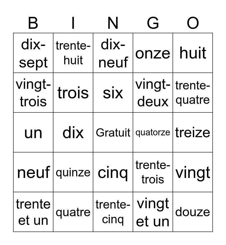 This bingo card has a free space and 40 words: zéro, un, deux, trois, quatre, cinq, six, sept, huit, neuf, dix, onze, douze, treize, quatorze, quinze, seize, dix-sept, dix-huit, dix-neuf, vingt, vingt et un, vingt-deux, vingt-trois, vingt-quatre, vingt-cinq, vingt-six, vingt-sept, vingt-huit, vingt-neuf, trente, trente et un, trente-deux, trente-trois, trente-quatre, trente-cinq, trente-six, trente-sept, trente-huit and trente-neuf.
