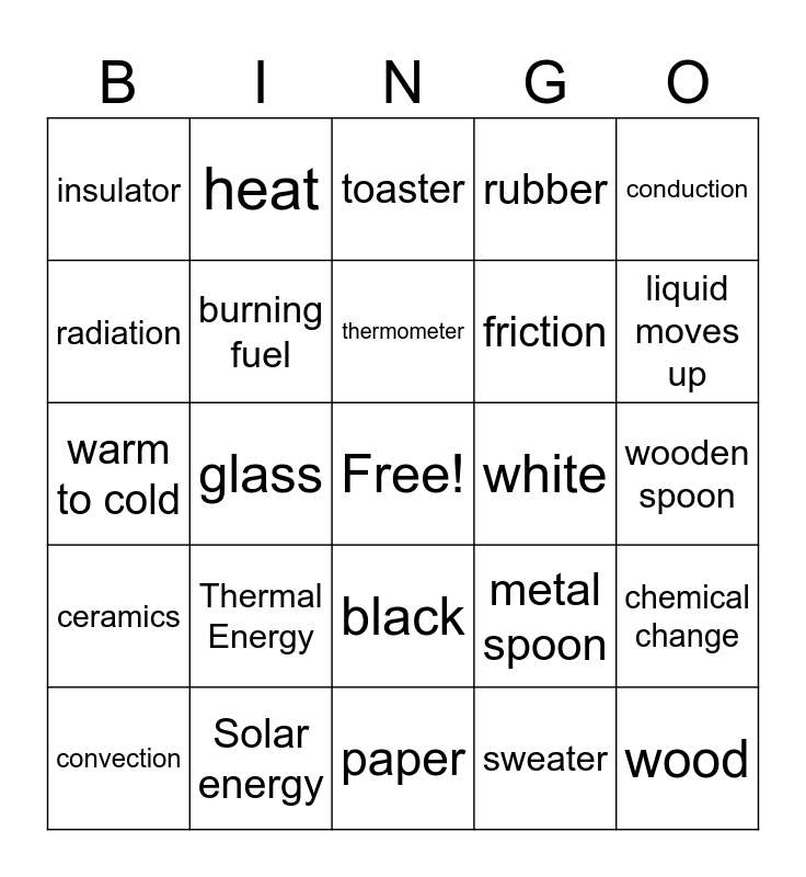 This bingo card has a free space and 24 words: Thermal Energy, Solar energy, thermometer, convection, conduction, insulator, radiation, heat, white, black, friction, warm to cold, metal spoon, chemical change, burning fuel, sweater, wooden spoon, toaster, liquid moves up, glass, wood, ceramics, rubber and paper.