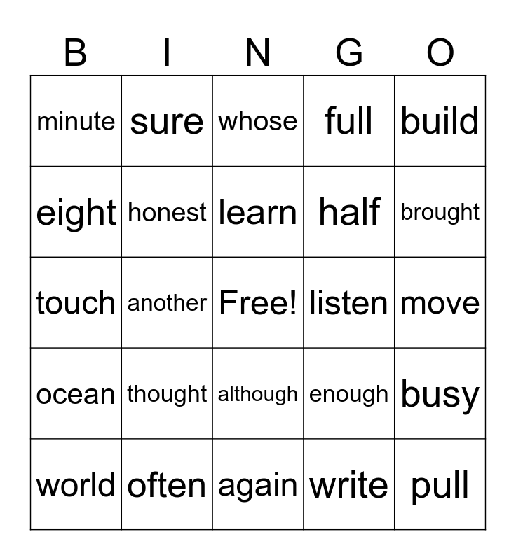 This bingo card has a free space and 29 words: world, fourth, another, because, minute, whose, honest, thought, listen, often, move, pull, again, write, brought, friend, although, ocean, build, touch, enough, laugh, half, eight, full, sure, busy, learn and where.