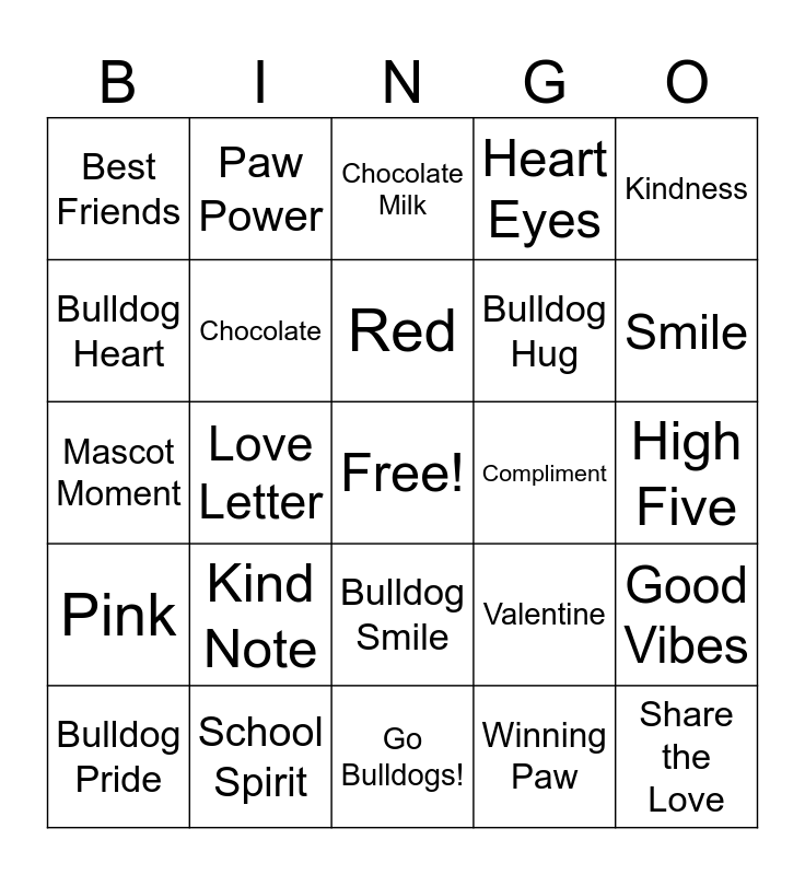 This bingo card has a free space and 36 words: Candy Hearts, Cupid, Roses, Chocolate, Valentine, Pink, Red, Hugs, Kindness, Friendship, Love Letter, Heart Eyes, Sweet Treat, Compliment, Smile, Best Friends, Crush, Kind Note, Share the Love, Chocolate Milk, High Five, Good Vibes, School Spirit, Bulldog Pride, Go Bulldogs!, Paw Power, Mascot Moment, School Spirit, Bulldog Hug, Bulldog Heart, Loyal Friend, Teamwork, Winning Paw, Bulldog Smile, Bulldog Strong and Cheer Loud.