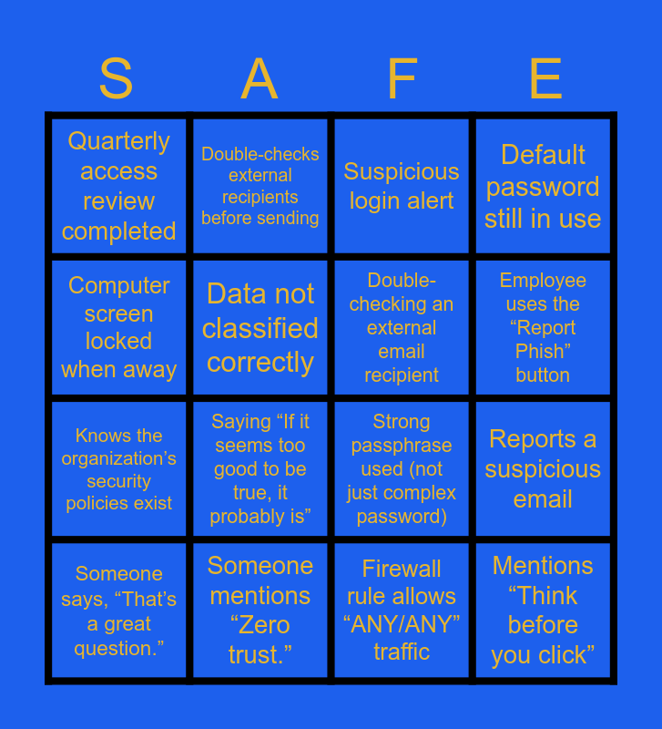This bingo card has 81 words: Multi-factor authentication (MFA) enabled, Phishing email reported, Suspicious login alert, Unpatched system identified, Shared credentials discovered, “Shadow IT” app found, Vendor without recent SOC 2 report, Missing BAA for a PHI‑handling vendor, Free!, High-risk vendor flagged, Excessive permissions (over‑privileged access), Public link sharing disabled on a file, Default password still in use, Quarterly access review completed, No documented incident response plan, Data not classified correctly, Missing evidence for an audit test, USB stick plugged into a corporate laptop, Sensitive data sent via unencrypted email, Firewall rule allows “ANY/ANY” traffic, “We’ll accept the risk” (without documentation 😉), Computer screen locked when away, Strong passphrase used (not just complex password), Employee uses the “Report Phish” button, Double-checking an external email recipient, Using secure file transfer instead of email, Verifying a payment/change request via phone, Reporting a lost or stolen device, Attending a security awareness training session, Updating software when prompted, Saying “If it seems too good to be true, it probably is”, “You’re on mute.”, “Can you see my screen?”, Pet appears on camera, Someone says “Let’s take that offline.”, Someone mentions “Zero trust.”, Someone mentions “AI” or “Copilot.”, “Sorry, I was on another call.”, Someone’s connection freezes mid‑sentence, Slide with a lot of tiny text, Someone says, “That’s a great question.”, Uses multi‑factor authentication, Creates a strong passphrase (not just a password), Locks computer when stepping away, Reports a suspicious email, Verifies sender email address, Double-checks external recipients before sending, Uses secure file transfer instead of email attachment, Deletes unexpected attachments, Updates software when prompted, Avoids downloading unknown applications, Hovering over links before clicking, “This looks like a phishing attempt”, Recognizes a fake login page, Reports a suspicious text message, Declines to share information over the phone, Notices spelling/grammar errors in a suspicious email, Recognizes an “urgent” or “act now” red flag, Identifies a spoofed sender name, Recognizes a suspicious QR code, Validates payment or change requests through a second channel, Avoids sending sensitive info unencrypted, Stores sensitive files securely, Uses approved systems for work files, Avoids public Wi‑Fi for work tasks, Shreds documents with personal or client info, Avoids taking photos/screenshots of client data, Deletes data they’re no longer authorized to retain, Uses company‑approved cloud storage, “If it seems too good to be true, it probably is”, Recognizes a scam or fake offer, Mentions “Think before you click”, Knows how to report an incident, Completes annual security training, Knows not to plug unknown USBs into devices, Uses only approved tools for work, Recognizes when someone asks for too much information, Forwards unusual emails to the security team, Avoids sharing credentials with anyone, Knows the organization’s security policies exist and Identifies suspicious activity on their account.