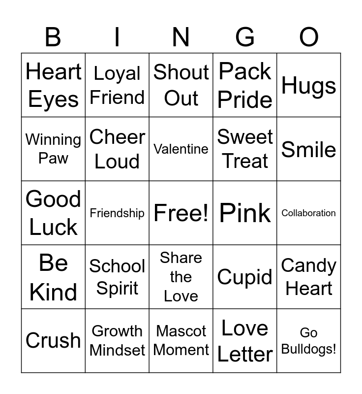 This bingo card has a free space and 47 words: Bulldog Pride, Go Bulldogs!, Paw Power, Mascot Moment, School Spirit, Bulldog Heart, Loyal Friend, Teamwork, Winning Paw, Bulldog Strong, Cheer Loud, Pack Pride, Candy Heart, Cupid, Roses, Chocolate, Valentine, Pink, Red, Hugs, Friendship, Love Letter, Heart Eyes, Sweet Treat, Compliment, Smile, Crush, Kind Note, Share the Love, Be Kind, Love Bug, Live Engaged, Integrity, Respectful, Resilience, Growth Mindset, Collaboration, Love Note, Love Song, Heartfelt, Smile Big, Shout Out, Good Luck, Happy Day, Awesome, Spread Joy and Teamwork.