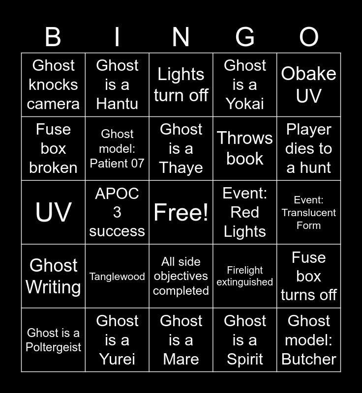 This bingo card has a free space and 123 words: Ghost is a Banshee, Ghost is a Dayan, Ghost is a Deogen, Ghost is a Demon, Ghost is a Gallu, Ghost is a Goryo, Ghost is a Hantu, Ghost is a Jinn, Ghost is a Mare, Ghost is a Moroi, Ghost is a Myling, Ghost is an Obambo, Ghost is an Obake, Ghost is an Oni, Ghost is an Onryo, Ghost is a Phantom, Ghost is a Poltergeist, Ghost is a Raiju, Ghost is a Revenant, Ghost is a Shade, Ghost is a Spirit, Ghost is a Thaye, Ghost is The Mimic, Ghost is The Twins, Ghost is a Wraith, Ghost is a Yokai, Ghost is a Yurei, EMF 5, D.O.T.S., Ghost orbs, Freezing Temps, UV, Ghost Writing, Spirit box, Burned crucifix, All crucifixes burned, All incense burned, All meds taken, Sound Recording, Motion sensed, Firelight extinguished, Disturbed salt, Ouija Board, Tarot Cards, Monkey's Paw, Music Box, Voodoo Doll, Summoning Circle, Haunted Mirror, Tanglewood, Edgefield, Ridgegview, Nell's Diner, Grafton Farmhouse, Willow, Maple Lodge, Camp Woodwind, Prison, Sunny Meadows (Restricted), Sunny Meadows (Full), Bleasdale Farmhouse, Brownstone Highschool, Point Hope, Banshee scream, Event: Ghost ball, Event: Red Lights, Event: Lights Break, Event: Shadow Form, Event: Translucent Form, Event: Full Form, Event: Singing, Event: Walking, Lights turn off, Door moves, Fast ghost, Blood Moon, Parabolic Sound, Obake UV, Deogen spirit box response, Polty bomb, Full door close, Car goes off, Fuse box turns off, Fuse box broken, Doom Slayed, Perfect run, Throws book, Dirty water, Revived player, All players die, One player dies, One player stays alive, Ghost model: Patient 07, Ghost model: Butcher, Ghost model: Lumberjack, Ghost model: Child, Ghost model: Grandma, Ghost model: Naked, Bone found, Spawn kill, All side objectives completed, No sanity meds taken, Ghost knocks camera, Ghost never hunts, Ghost is male, Ghost is female, APOC 3 success, Leave with cursed object, Leave with a snack for the road, Leave with all shoes, Leave by sneaking with a stuffy, Leave with frog(?) stuffy, Leave with all stuffies, Leave with potato, Silent round, Use the cursed object without any player knowing, Van Princess, Player AFKs mid-round, Player forgets to mark ghost in journal, Ghost crawls, Ghost bends backwards, Player dies to a hunt and Ghost model: dude with the scythe/sickle.