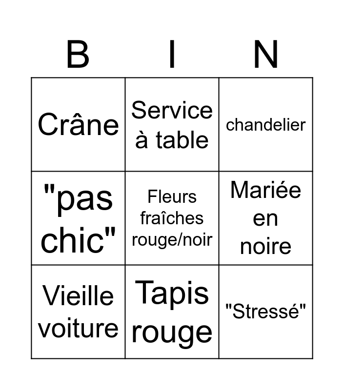 This bingo card has a free space and 8 words: Mariée en noire, chandelier, Service à table, Vieille voiture, Crâne, "Stressé", "pas chic" and Tapis rouge.