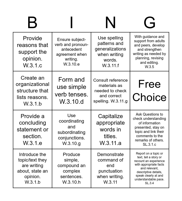 This bingo card has 16 words: Introduce the topic/text they are writing about, state an opinion. W.3.1.b, Produce simple, compound an complex sentences. W.3.10.h, Use spelling patterns and generalizations when writing words. W.3.11.f, With guidance and support from adults and peers, develop and strengthen writing as needed by planning, revising and editing. W.3.5, Create an organizational structure that lists reasons. W.3.1.b, Ensure subject-verb and pronoun- antecedent agreement when writing. W.3.10.e, Capitalize appropriate words in titles. W.3.11.a, Ask Questions to check understanding of information presented, stay on topic and link their comments to the remarks of others. SL.3.1.c, Provide reasons that support the opinion. W.3.1.c, Form and use simple verb tenses. W.3.10.d, Demonstrate command of end punctuation when writing. W.3.11, Free Choice, Provide a concluding statement or section. W.3.1.e, Use coordinating and subordinating conjunctions. W.3.10.g, Consult reference materials as needed to check and correct spelling. W.3.11.g and Report on a topic or text, tell a story or recount an experience with appropriate facts and relevant, descriptive details, speak clearly at and understandable pace. SL.3.4.