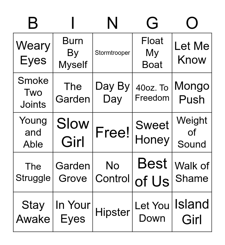 This bingo card has a free space and 40 words: Sky Is the Limit, Young and Able, She's Gone, The Garden, In Your Eyes, No Control, Day By Day, Slow Ride, Let Me Know, The Struggle, Slow Girl, Float My Boat, Island Girl, Weight of Sound, Sweet Honey, Garden Grove, Alone, Weary Eyes, Not Done Yet, Stormtrooper, Walk of Shame, Let You Down, 40oz. To Freedom, Smoke Two Joints, Get Ready, Mellow Mood, Nice Time, Wanted, Oxygen, Bowl For Two, Let Her Go, Stay Awake, Tradewinds, Best of Us, Mongo Push, Hipster, Notice, Smoke Rings, Burn By Myself and We Will Rise.