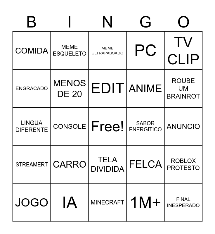 This bingo card has a free space and 24 words: CARRO, IA, EDIT, JOGO, TV CLIP, COMIDA, ENGRACADO, MEME ESQUELETO, SABOR ENERGITICO, TELA DIVIDIDA, ANIME, LINGUA DIFERENTE, FELCA, ROBLOX PROTESTO, MENOS DE 20, 1M+, ANUNCIO, MEME ULTRAPASSADO, ROUBE UM BRAINROT, CONSOLE, FINAL INESPERADO, STREAMERT, PC and MINECRAFT.