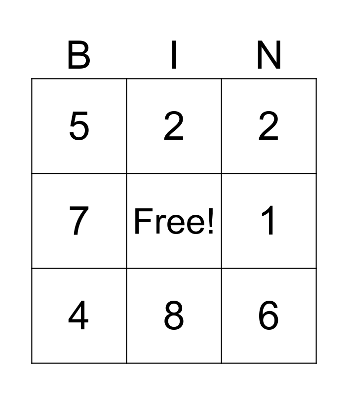 This bingo card has a free space and 8 words: 1, 2, 2, 4, 5, 6, 7 and 8.