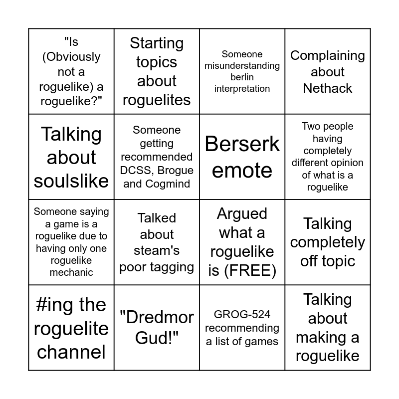 This bingo card has 16 words: "Dredmor Gud!", Talking completely off topic, Someone misunderstanding berlin interpretation, "Is (Obviously not a roguelike) a roguelike?", Someone saying a game is a roguelike due to having only one roguelike mechanic, Starting topics about roguelites, Argued what a roguelike is (FREE), GROG-524 recommending a list of games, Talking about soulslike, Someone getting recommended DCSS, Brogue and Cogmind, #ing the roguelite channel, Complaining about Nethack, Talked about steam's poor tagging, Two people having completely different opinion of what is a roguelike, Berserk emote and Talking about making a roguelike.
