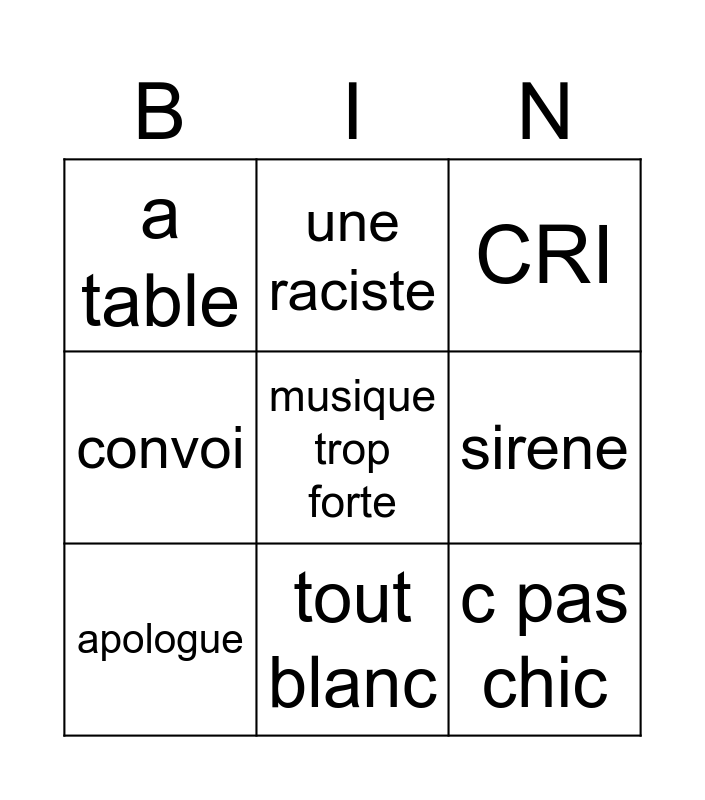 This bingo card has 9 words: apologue, CRI, une raciste, convoi, a table, sirene, musique trop forte, c pas chic and tout blanc.