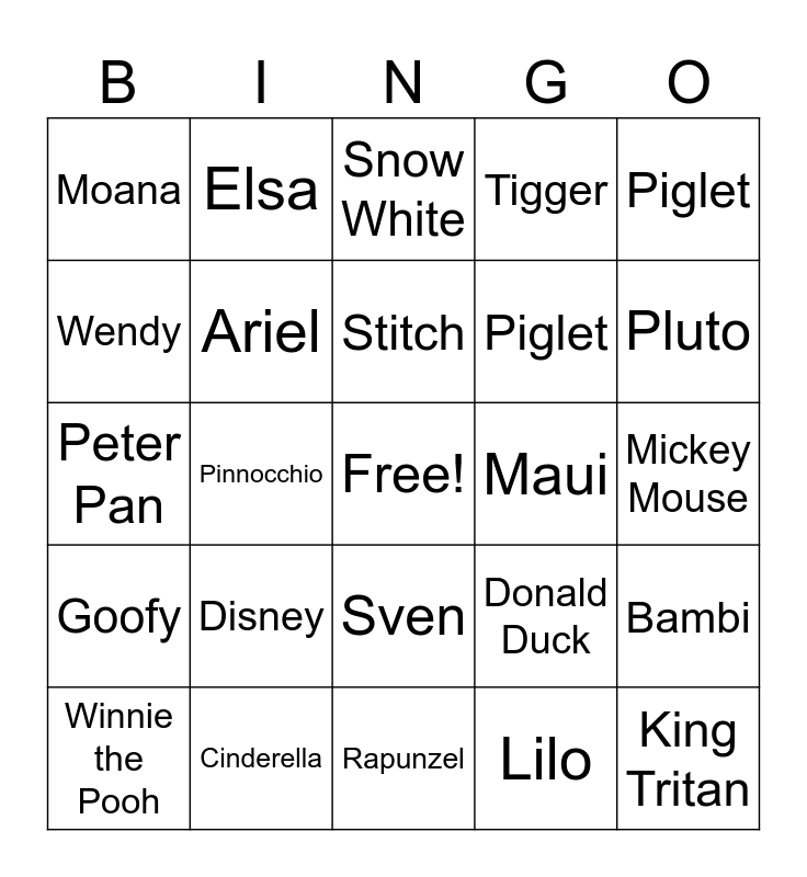 This bingo card has a free space and 24 words: Disney, Cinderella, Stitch, Winnie the Pooh, Piglet, Moana, Wendy, Elsa, Maui, Sven, Piglet, Peter Pan, Donald Duck, Bambi, Ariel, Lilo, Mickey Mouse, Snow White, Pluto, Pinnocchio, King Tritan, Goofy, Tigger and Rapunzel.