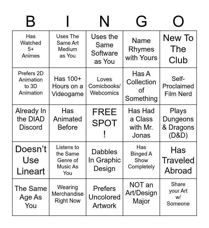 This bingo card has a free space and 24 words: Listens to the Same Genre of Music As You, Wearing Merchandise Right Now, Loves Comicbooks/ Webcomics, The Same Age As You, New To The Club, Has Watched 5+ Animes, Prefers 2D Animation to 3D Animation, Uses The Same Art Medium as You, Has Had a Class with Mr. Jonas, Dabbles In Graphic Design, Has A Collection of Something, Already In the DIAD Discord, Has Binged A Show Completely, Has Traveled Abroad, Has 100+ Hours on a Videogame, NOT an Art/Design Major, Plays Dungeons & Dragons (D&D), Uses the Same Software as You, Self-Proclaimed Film Nerd, Has Animated Before, Share your Art w/ Someone, Doesn’t Use Lineart, Name Rhymes with Yours and Prefers Uncolored Artwork.