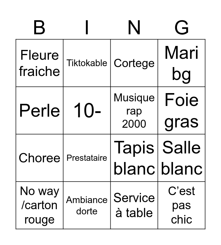 This bingo card has 16 words: Ambiance dorte, Salle blanc, Cortege, Fleure fraiche, Choree, Tiktokable, Tapis blanc, Service à table, Perle, 10-, No way /carton rouge, Mari bg, Prestataire, Foie gras, Musique rap 2000 and C’est pas chic.