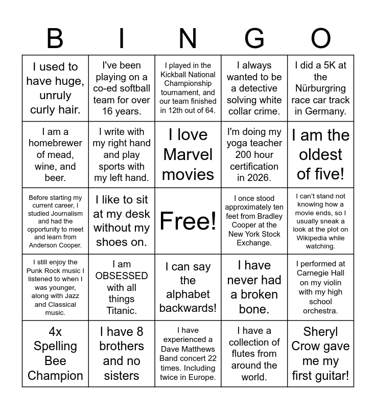 This bingo card has a free space and 26 words: I can say the alphabet backwards!, I have a collection of flutes from around the world., I love Marvel movies, I have 8 brothers and no sisters, I did a 5K at the Nürburgring race car track in Germany., I used to have huge, unruly curly hair., I am a homebrewer of mead, wine, and beer., I've been playing on a co-ed softball team for over 16 years., I can’t stand not knowing how a movie ends, so I usually sneak a look at the plot on Wikipedia while watching., I have never had a broken bone., I'm doing my yoga teacher 200 hour certification in 2026., Before starting my current career, I studied Journalism and had the opportunity to meet and learn from Anderson Cooper., I performed at Carnegie Hall on my violin with my high school orchestra., 4x Spelling Bee Champion, I like to sit at my desk without my shoes on., I have a Basset Hound named Wilson who weighs 80 pounds!, I always wanted to be a detective solving white collar crime., I still enjoy the Punk Rock music I listened to when I was younger, along with Jazz and Classical music., I played in the Kickball National Championship tournament, and our team finished in 12th out of 64., Sheryl Crow gave me my first guitar!, I am the oldest of five!, I have experienced a Dave Matthews Band concert 22 times. Including twice in Europe., I once stood approximately ten feet from Bradley Cooper at the New York Stock Exchange., I am OBSESSED with all things Titanic., I write with my right hand and play sports with my left hand. and I can wiggle my right ear.
