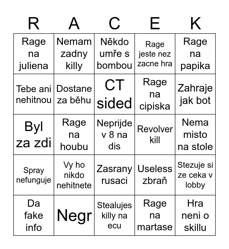 This bingo card has a free space and 46 words: Ma jen jedno sluchatko, Hra neni o skillu, Jses lucky, Stealujes killy na ecu, Vy ho nikdo nehitnete, Houba pedofil, Nemam zadny killy, Yapping o praci, Tebe ani nehitnou, Hra nefunguje, Dostane za běhu, Rage jeste nez zacne hra, Stezuje si ze ceka v lobby, Useless zbraň, Maj low, Zase jdu první, CT sided, Revolver kill, Rage na granát, Rage na papika, Rage na houbu, Rage na martase, Rage na juliena, Rage na cipiska, Nekouka na radar, Zahraje jak bot, Da fake info, Dostane od teamu, Zasrany rusaci, Spray nefunguje, Dostane jednicku, Dal bych ještě jednu, Malej headshot rate, Zasrany turci, Kys, Negr, Nema misto na stole, Dostane block, Ban dust, WHAAAT!, Posledni v tabulce (bez houby), Někdo umře s bombou, Byl za zdi, Jak to ze to nebyla hlava, Ma hlad and Nejde nic maj awp.