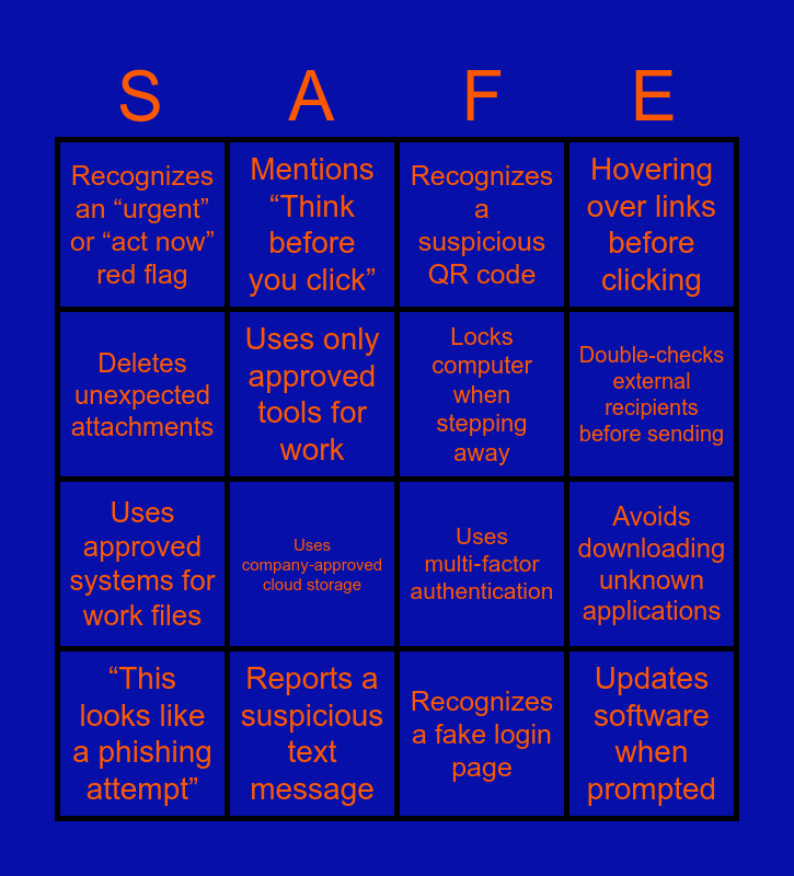 This bingo card has 41 words: Free!, Uses multi‑factor authentication, Creates a strong passphrase (not just a password), Locks computer when stepping away, Reports a suspicious email, Verifies sender email address, Double-checks external recipients before sending, Uses secure file transfer instead of email attachment, Deletes unexpected attachments, Updates software when prompted, Avoids downloading unknown applications, Hovering over links before clicking, “This looks like a phishing attempt”, Recognizes a fake login page, Reports a suspicious text message, Declines to share information over the phone, Notices spelling/grammar errors in a suspicious email, Recognizes an “urgent” or “act now” red flag, Identifies a spoofed sender name, Recognizes a suspicious QR code, Validates payment or change requests through a second channel, Avoids sending sensitive info unencrypted, Stores sensitive files securely, Uses approved systems for work files, Avoids public Wi‑Fi for work tasks, Shreds documents with personal or client info, Avoids taking photos/screenshots of client data, Deletes data they’re no longer authorized to retain, Uses company‑approved cloud storage, “If it seems too good to be true, it probably is”, Recognizes a scam or fake offer, Mentions “Think before you click”, Knows how to report an incident, Completes annual security training, Knows not to plug unknown USBs into devices, Uses only approved tools for work, Recognizes when someone asks for too much information, Forwards unusual emails to the security team, Avoids sharing credentials with anyone, Knows the organization’s security policies exist and Identifies suspicious activity on their account.