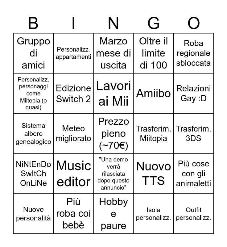 This bingo card has a free space and 24 words: Music editor, Più roba coi bebè, Lavori ai Mii, Nuove personalità, Roba regionale sbloccata, Gruppo di amici, Personalizz. personaggi come Miitopia (o quasi), Personalizz. appartamenti, Trasferim. Miitopia, "Una demo verrà rilasciata dopo questo annuncio", Amiibo, Sistema albero genealogico, Nuovo TTS, Più cose con gli animaletti, Edizione Switch 2, Isola personalizz., Trasferim. 3DS, Marzo mese di uscita, Relazioni Gay :D, Meteo migliorato, Outfit personalizz., NiNtEnDo SwItCh OnLiNe, Oltre il limite di 100 and Hobby e paure.
