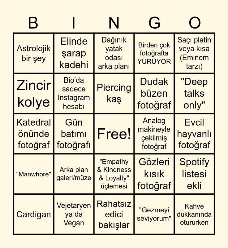 This bingo card has a free space and 24 words: Arka plan galeri/müze, Vejetaryen ya da Vegan, Piercing kaş, Cardigan, Saçı platin veya kısa (Eminem tarzı), Astrolojik bir şey, Zincir kolye, Elinde şarap kadehi, Analog makineyle çekilmiş fotoğraf, "Empathy & Kindness & Loyalty" üçlemesi, Dudak büzen fotoğraf, Katedral önünde fotoğraf, Gözleri kısık fotoğraf, Spotify listesi ekli, Bio’da sadece Instagram hesabı, "Gezmeyi seviyorum", Evcil hayvanlı fotoğraf, Dağınık yatak odası arka planı, "Deep talks only", Gün batımı fotoğrafı, Kahve dükkanında otururken, "Manwhore", Birden çok fotoğrafta YÜRÜYOR and Rahatsız edici bakışlar.