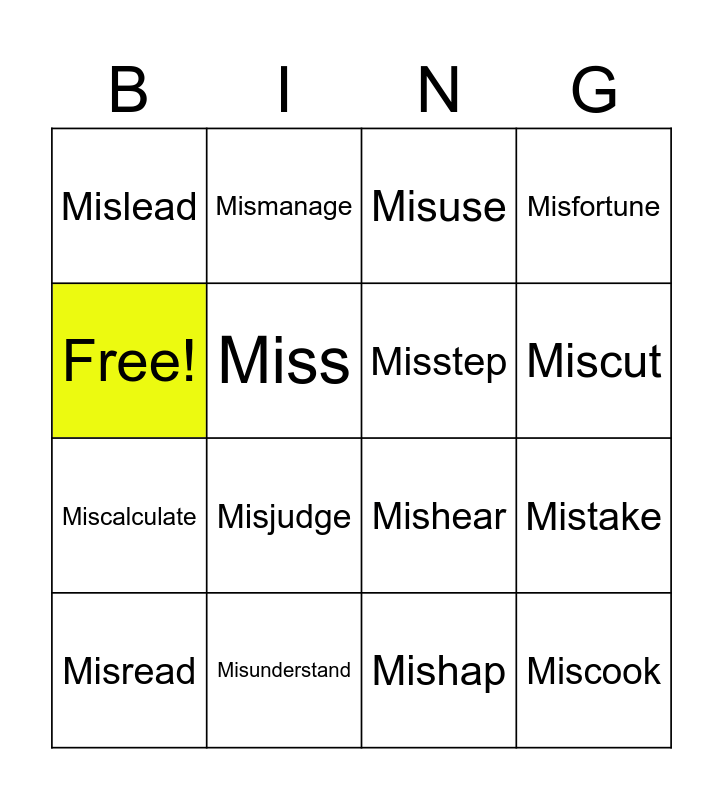 This bingo card has 16 words: Misunderstand, Mistake, Misuse, Mislead, Miscalculate, Mismanage, Mishear, Mishap, Free!, Miss, Misread, Misfortune, Misjudge, Miscut, Misstep and Miscook.