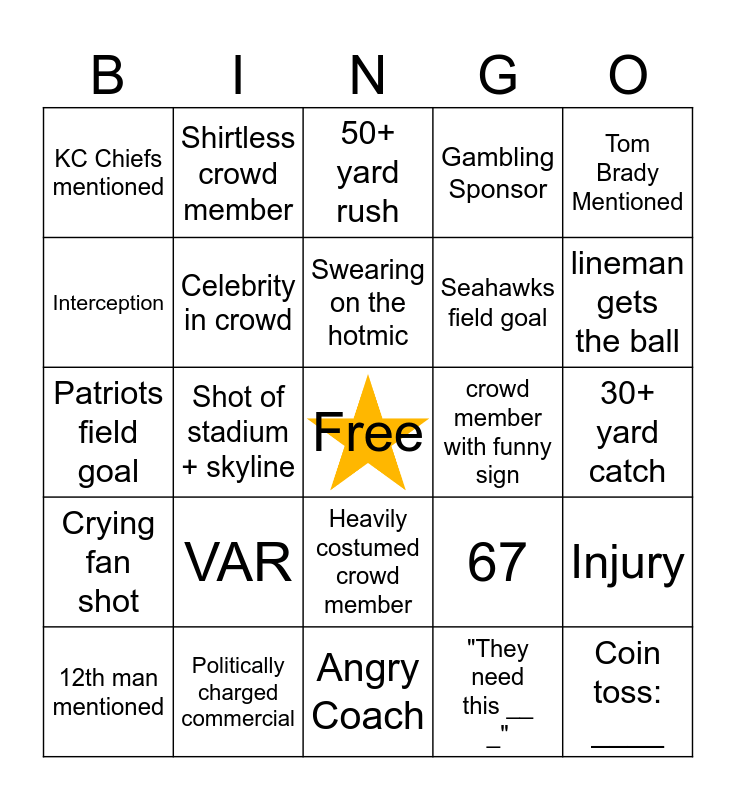 This bingo card has a free space and 24 words: VAR, Politically charged commercial, Swearing on the hotmic, 12th man mentioned, Tom Brady Mentioned, KC Chiefs mentioned, Interception, Shirtless crowd member, crowd member with funny sign, Heavily costumed crowd member, Seahawks field goal, Patriots field goal, 67, Injury, Celebrity in crowd, "They need this ___", 30+ yard catch, 50+ yard rush, lineman gets the ball, Shot of stadium + skyline, Coin toss: ____, Crying fan shot, Gambling Sponsor and Angry Coach.