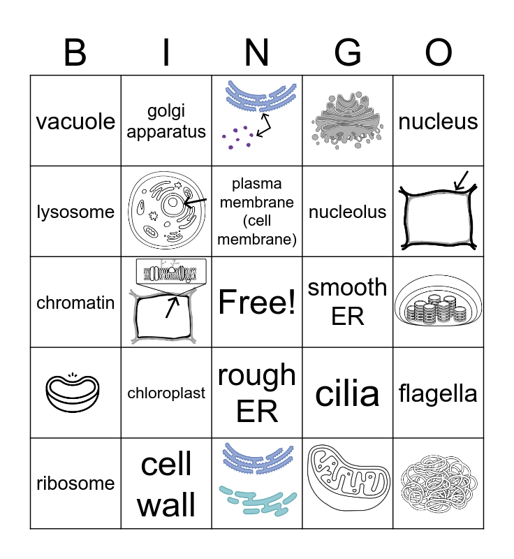This bingo card has 10 images, a free space and 14 words: chloroplast, cell wall, plasma membrane (cell membrane), ribosome, nucleus, vacuole, lysosome, golgi apparatus, smooth ER, rough ER, nucleolus, chromatin, cilia and flagella.
