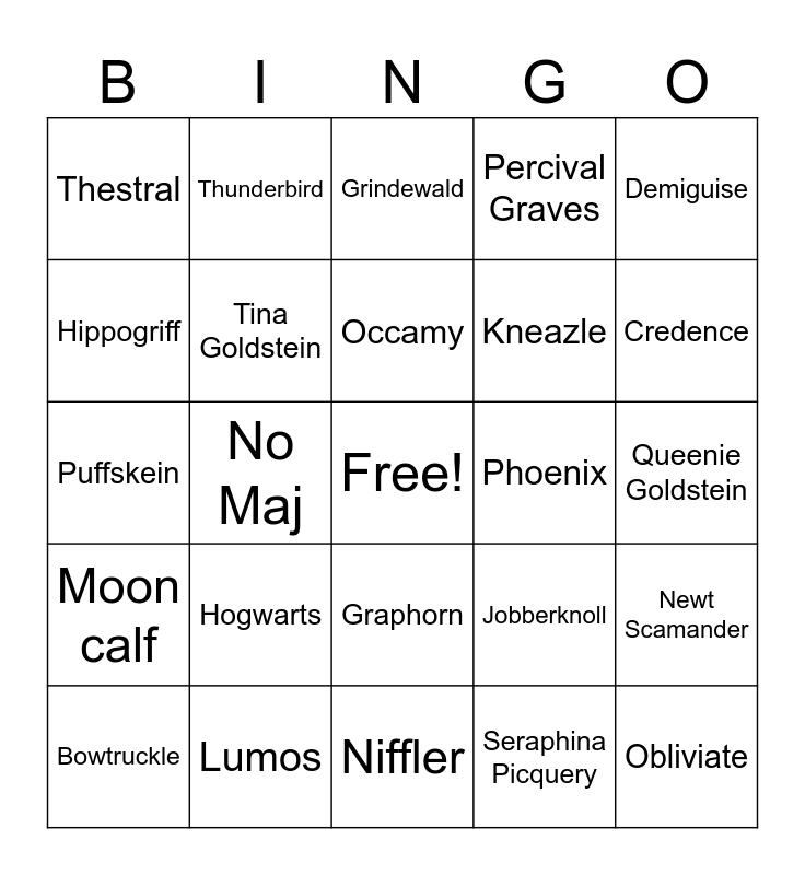 This bingo card has a free space and 25 words: Hogwarts, Niffler, Occamy, Bowtruckle, Demiguise, Thestral, Hippogriff, Thunderbird, Phoenix, Graphorn, Kneazle, Puffskein, Jobberknoll, Newt Scamander, Tina Goldstein, Jacob Kowalski, Queenie Goldstein, Grindewald, Credence, No Maj, Obliviate, Lumos, Moon calf, Percival Graves and Seraphina Picquery.