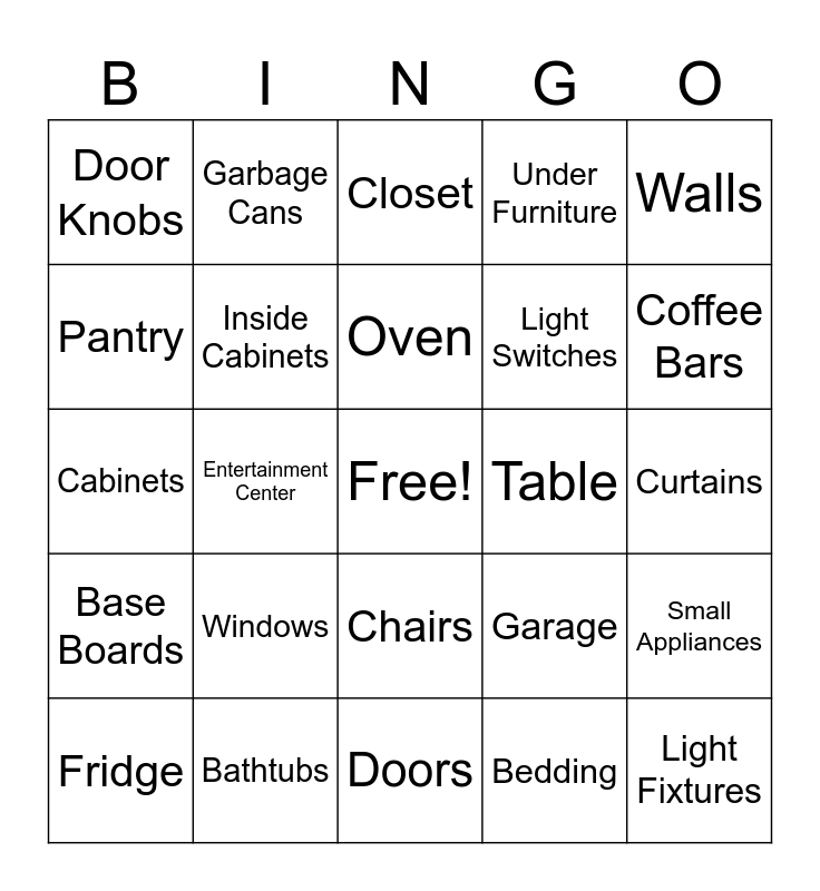 This bingo card has a free space and 24 words: Windows, Bathtubs, Oven, Fridge, Walls, Door Knobs, Pantry, Garbage Cans, Table, Chairs, Light Switches, Cabinets, Garage, Small Appliances, Inside Cabinets, Bedding, Curtains, Closet, Coffee Bars, Entertainment Center, Light Fixtures, Base Boards, Under Furniture and Doors.