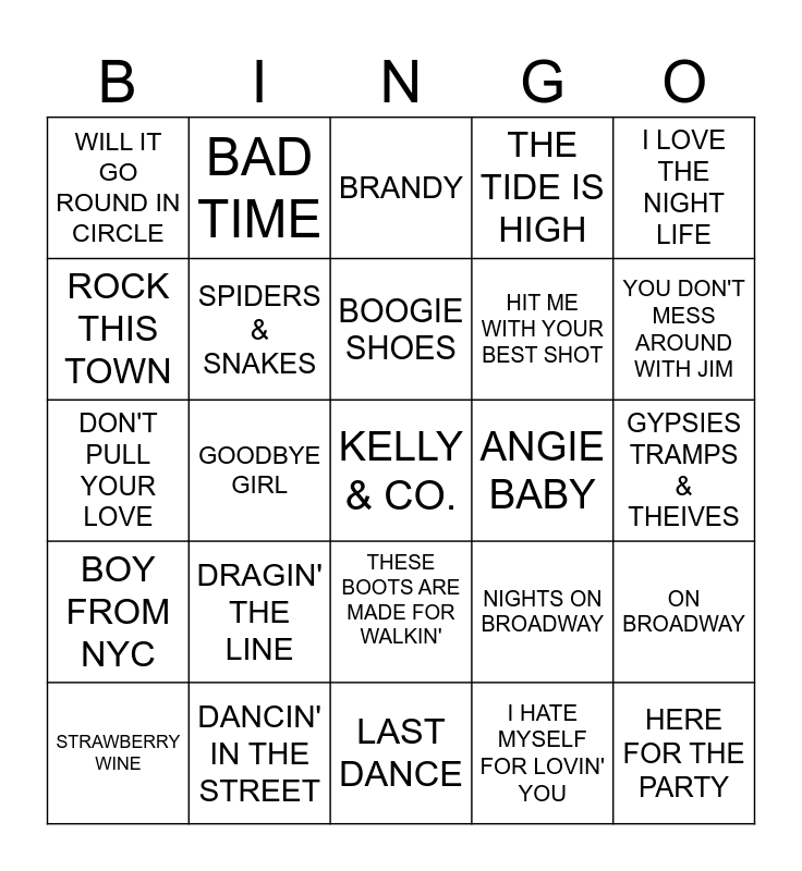This bingo card has a free space and 54 words: DARK LADY, BOY FROM NYC, SUDS IN THE BUCKET, PONTOON, THESE BOOTS ARE MADE FOR WALKIN', I LOVE ROCK & ROLL, THE TIDE IS HIGH, HOPELESSLY DEVOTED TO YOU, ROCK THIS TOWN, LOVE WILL KEEP US TOGETHER, WILL IT GO ROUND IN CIRCLE, RIGHT TIME OF THE NIGHT, DANCIN' IN THE STREET, STRAWBERRY WINE, LOVE TRAIN, LAST DANCE, HERE FOR THE PARTY, HIT ME WITH YOUR BEST SHOT, REDNECK WOMAN, GYPSIES TRAMPS & THEIVES, NIGHTS ON BROADWAY, KNOCK ON WOOD, ANGIE BABY, I LOVE THE NIGHT LIFE, GO YOUR OWN WAY, BAD TIME, DELTA DAWN, WHEN WILL I BE LOVED, HOT STUFF, I HATE MYSELF FOR LOVIN' YOU, FIRE & RAIN, CHANGES IN LATTITUDES, BAD LEROY BROWN, GLEN CAMPBELL, BRANDY, KODACHROME, DON'T PULL YOUR LOVE, ON BROADWAY, WAGON WHEEL, SPIDERS & SNAKES, ROCKIN' PNEUMONIA, LOVE WILL TURN YOU AROUND, BROWN EYED GIRL, I LOVE A RAINY NIGHT, DRAGIN' THE LINE, UNDER THE BOARDWALK, BOOT SCOOTIN' BOOGIE, MARGARITAVILLE, BOOGIE SHOES, GOODBYE GIRL, YOU DON'T MESS AROUND WITH JIM, SISTER GOLDEN HAIR, CAREFREE HIGHWAY and NO SUGAR TONIGHT.