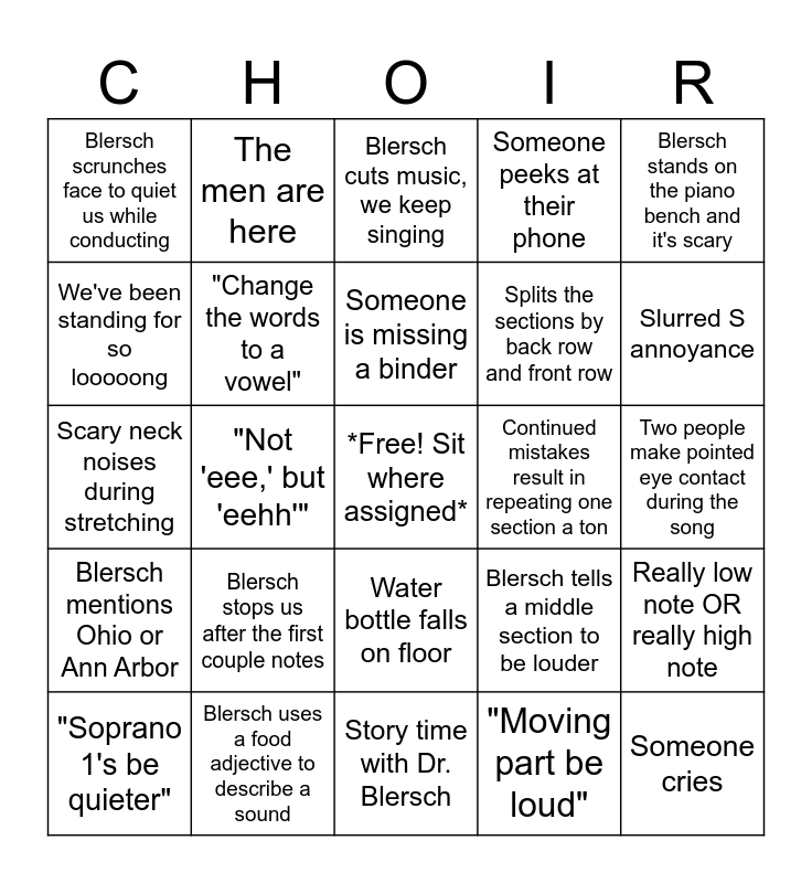 This bingo card has a free space and 29 words: "Soprano 1's be quieter", "More 'C'", "Not 'eee,' but 'eehh'", Blersch makes beefy face for rich sound, Blersch scrunches face to quiet us while conducting, Blersch cuts music, we keep singing, "Change the words to a vowel", Blersch stops us after the first couple notes, Continued mistakes result in repeating one section a ton, Blersch uses a food adjective to describe a sound, Two people make pointed eye contact during the song, Someone cries, Story time with Dr. Blersch, "Moving part be loud", Slurred S annoyance, "Get rid of that letter", Water bottle falls on floor, Blersch mentions Ohio or Ann Arbor, Blersch stands on the piano bench and it's scary, Scary neck noises during stretching, Blersch tells a middle section to be louder, We make a change to the score, Splits the sections by back row and front row, We've been standing for so looooong, Someone peeks at their phone, The men are here, Really low note OR really high note, Someone is missing a binder and We actually run through a piece without stopping!!.