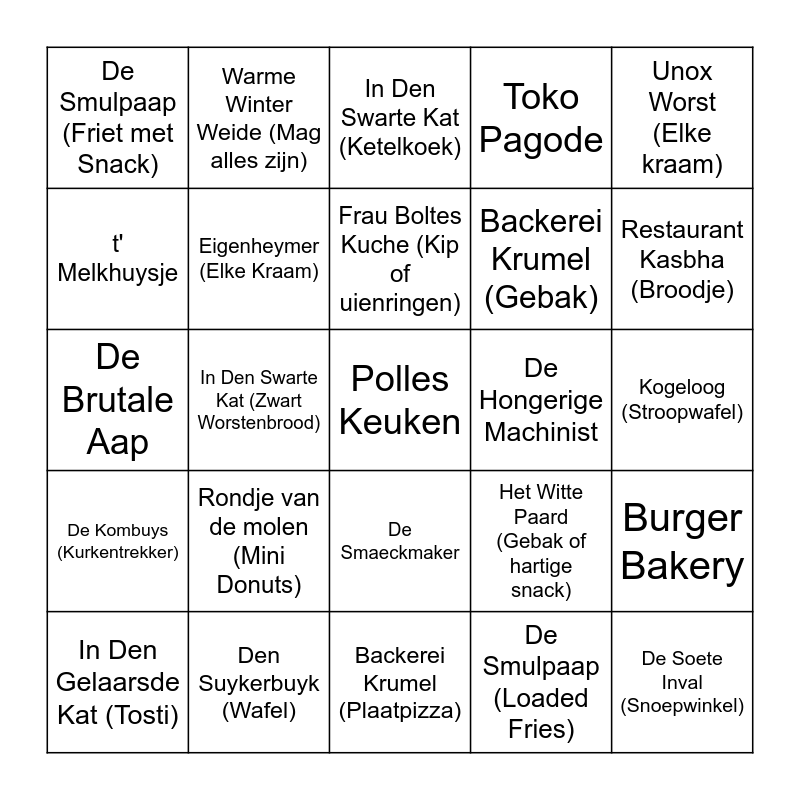 This bingo card has a free space and 24 words: Rondje van de molen (Mini Donuts), Den Suykerbuyk (Wafel), Frau Boltes Kuche (Kip of uienringen), In Den Gelaarsde Kat (Tosti), Unox Worst (Elke kraam), De Smulpaap (Friet met Snack), t' Melkhuysje, Warme Winter Weide (Mag alles zijn), De Hongerige Machinist, De Smaeckmaker, Backerei Krumel (Gebak), De Brutale Aap, Het Witte Paard (Gebak of hartige snack), Burger Bakery, Eigenheymer (Elke Kraam), De Smulpaap (Loaded Fries), Kogeloog (Stroopwafel), In Den Swarte Kat (Ketelkoek), Restaurant Kasbha (Broodje), In Den Swarte Kat (Zwart Worstenbrood), De Soete Inval (Snoepwinkel), De Kombuys (Kurkentrekker), Toko Pagode and Backerei Krumel (Plaatpizza).